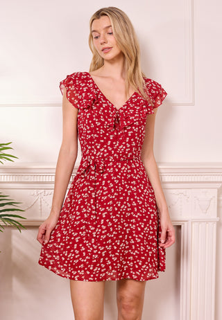 Asymmetrical Hem Tie Belt Mini Dress in White Blue Floral
