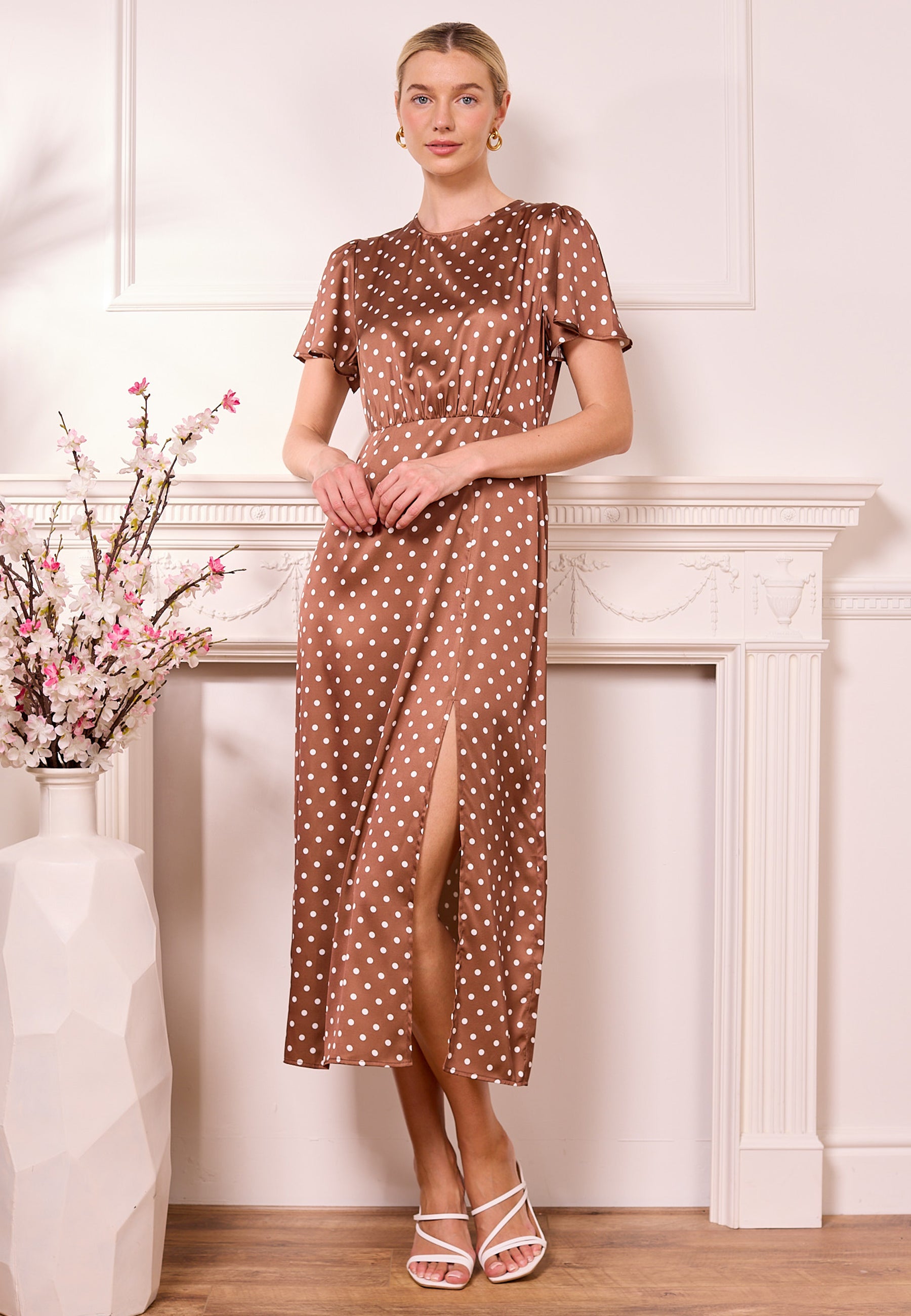 Elevate your wardrobe this Brown Satin Polka Dot Midi Dress by ANGELEYE, a perfect blend of elegance and playfulness. The luxurious satin fabric drapes beautifully, while the classic polka dot pattern adds a touch of whimsy. Ideal for both daytime outings and evening events, this versatile dress features a flattering midi length that complements all body types. Pair it with heels for a chic look or dress it down with flats for a casual vibe. Don’t miss out on this timeless piece that promises to turn heads wherever you go!