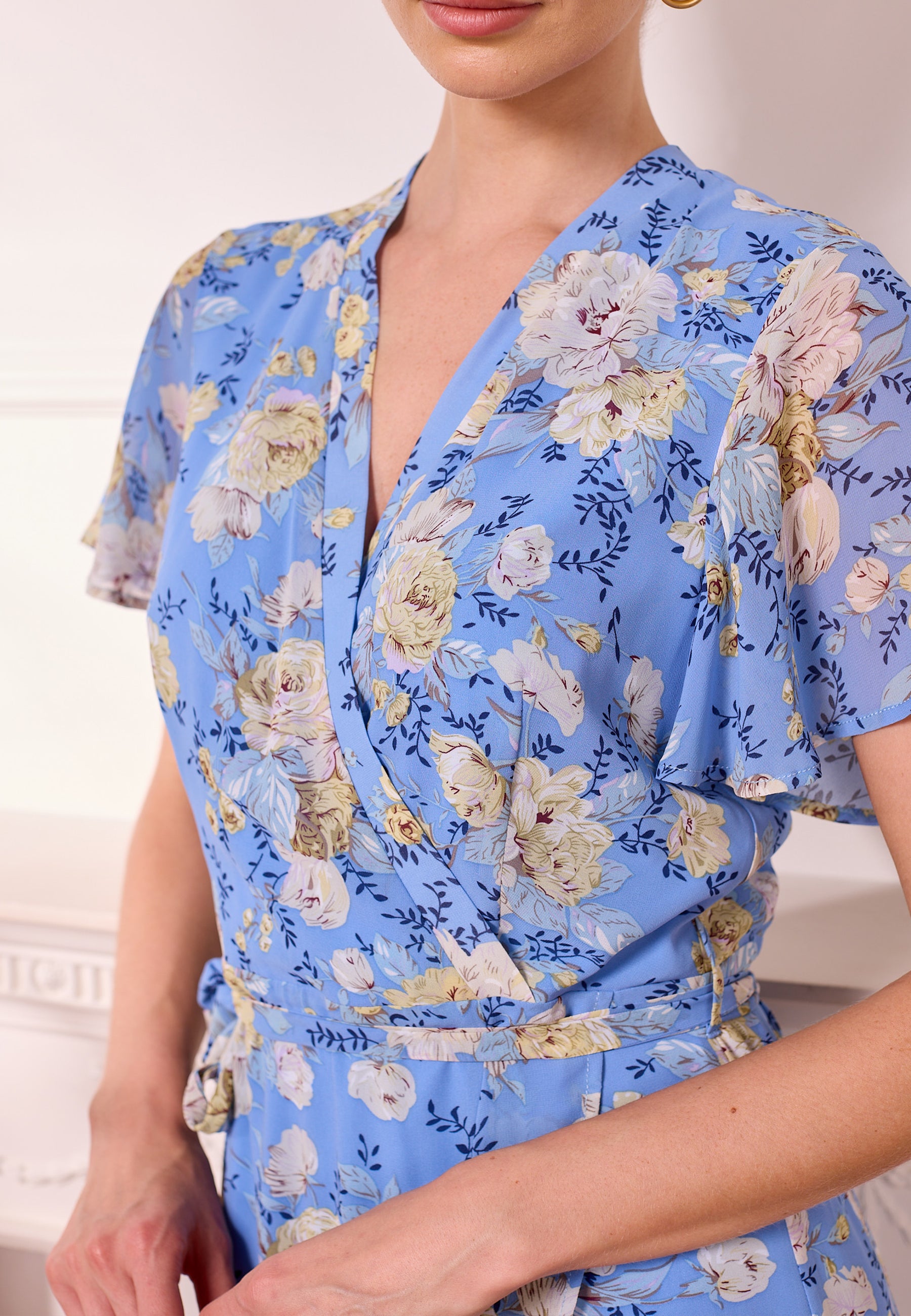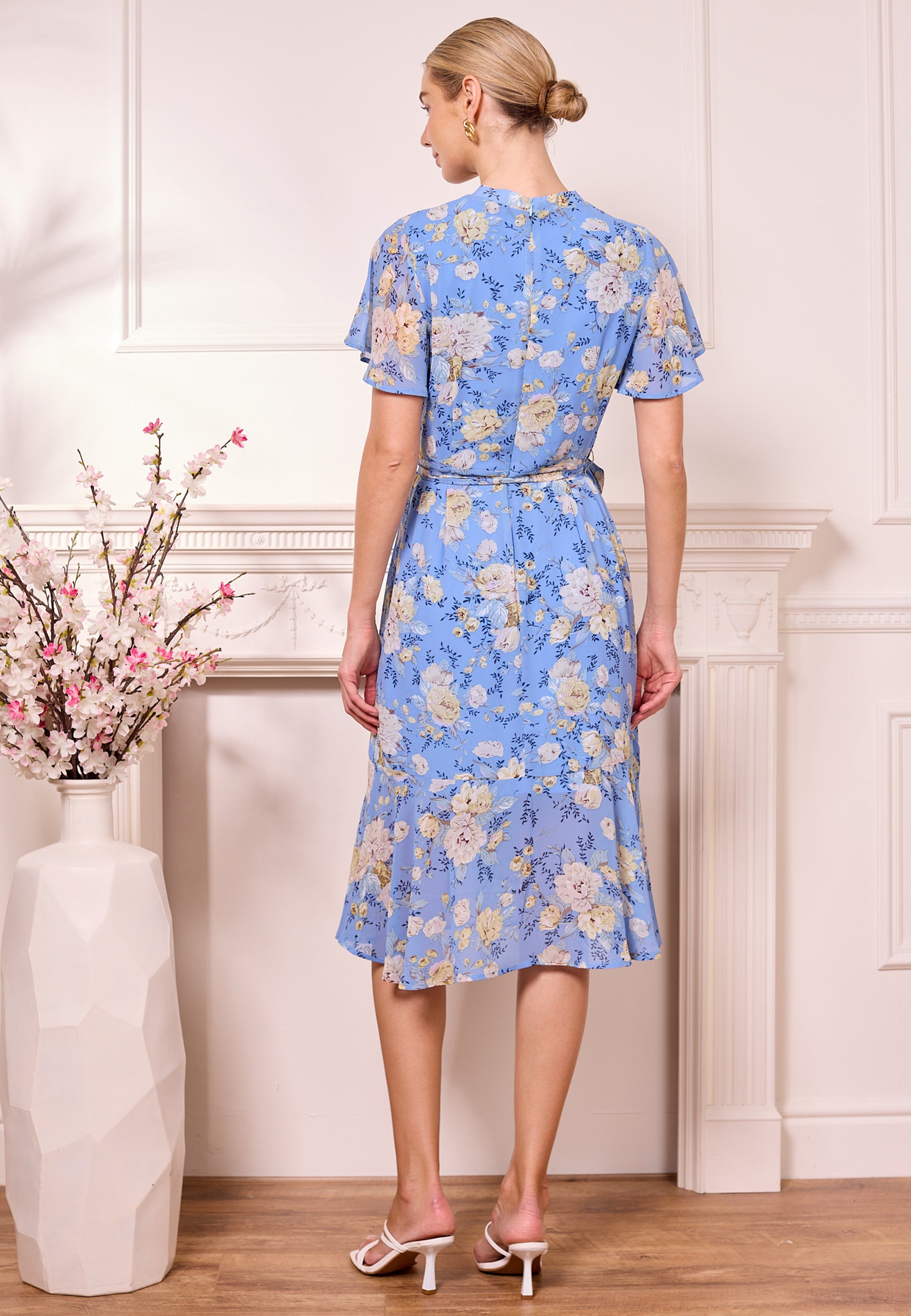 This Light Blue Faux Wrap Floral Midi Dress by ANGELEYE is a perfect blend of elegance and comfort. This dress features a floral pattern on chiffon, while the faux wrap design flatters your silhouette effortlessly. Ideal for any occasion, this dress is versatile and stylish. Pair it with your favourite heels or sandals for a chic look.