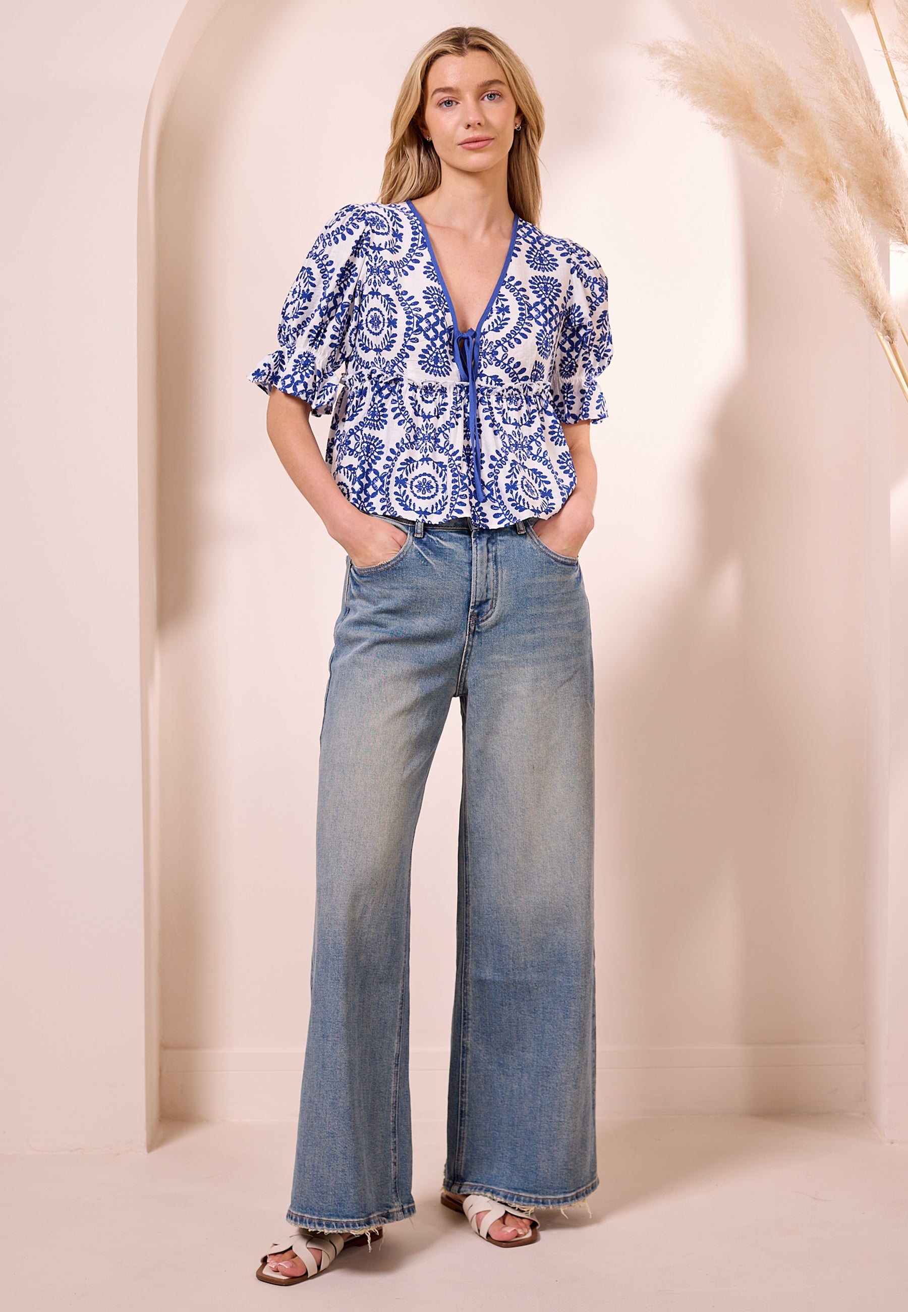 This chic White Peplum blouse by ANGELEYE featuring a delicate blue embroidery print beautifully combines elegance and comfort, making it perfect for everyday. The flattering peplum silhouette accentuates your waist perfect with the wide-legged jeans creating a trendy, relaxed look. Pair it with your favourite accessories for a stylish ensemble.