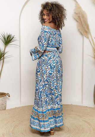 Bardot Top Maxi Skirt Co-ord in Blue Boho Print