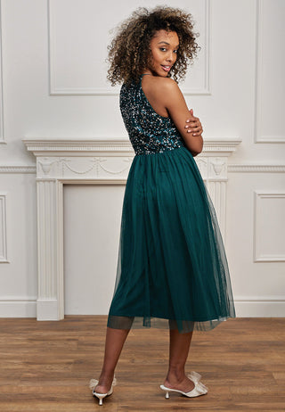 Embellished Halterneck Sequin Midi Dress in Navy - ANGELEYE