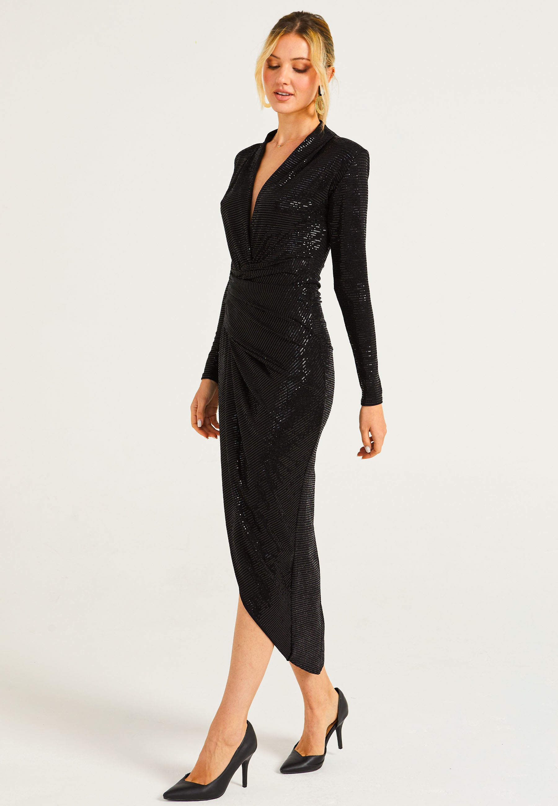 Be sure to impress when you step out in this Sequin Faux Wrap Midi Dress in Black. This body-hugging midi will flatter your silhouette to perfection. Teamed with some heeled sandals and a mini bag, you're ready to go!