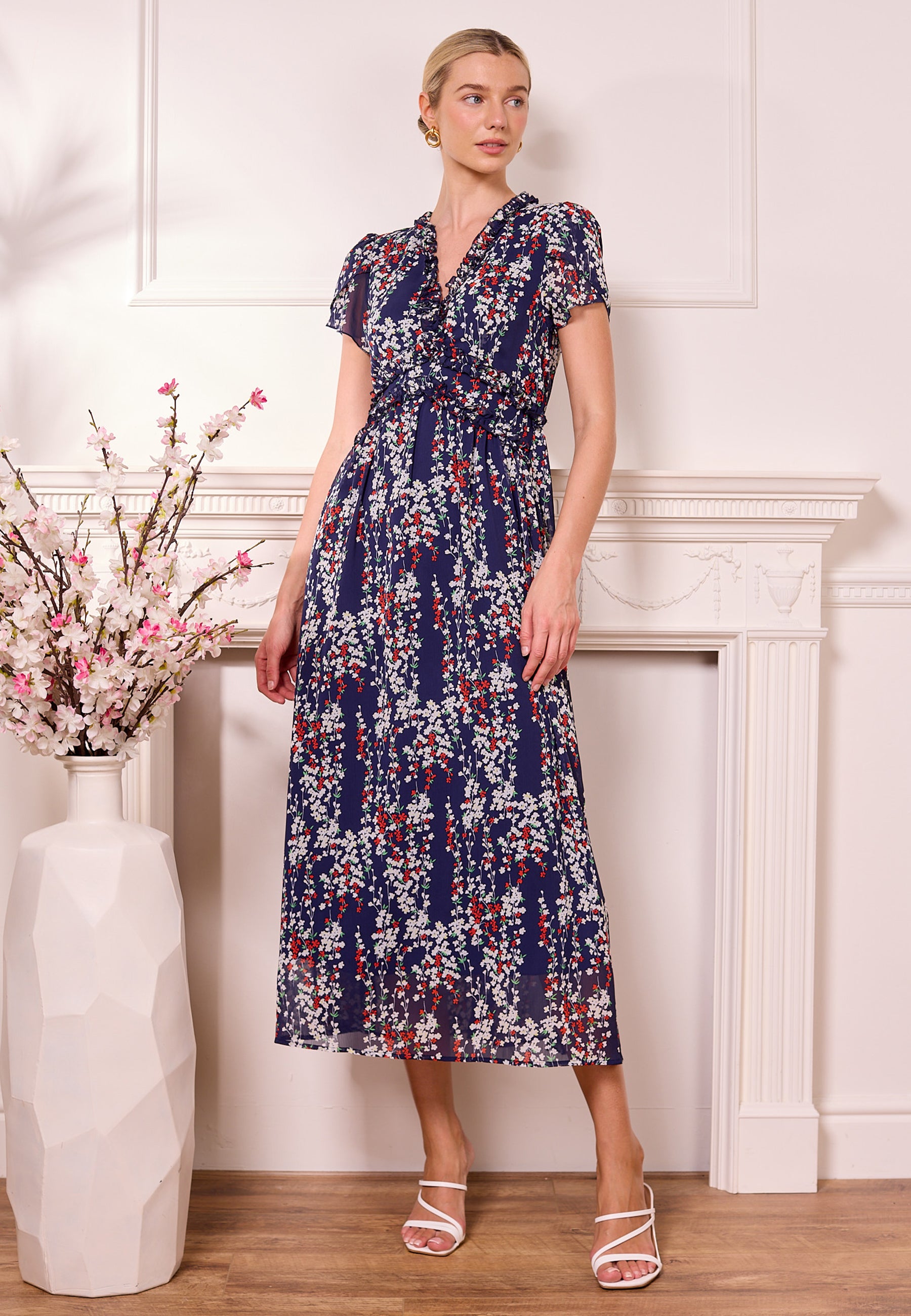 ANGELEYE's Floral Navy Midi Dress featuring elegant tulip sleeves and floral print that adds a touch of femininity, making it perfect for both casual outings and special occasions. Crafted from chiffon, this dress ensures all-day comfort while keeping you stylish. Pair it with your favourite heels or sandals for a chic look.
