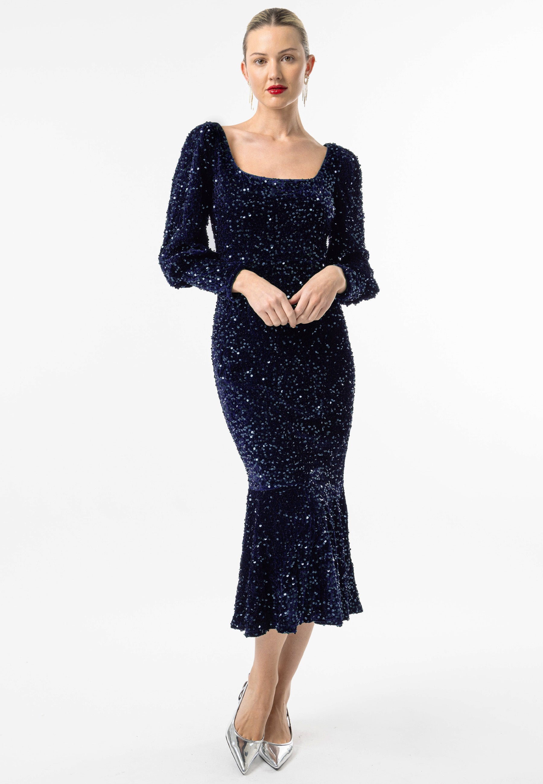 A gorgeous Sequin Velvet Bodycon Evening Dress in Navy by ANGELEYE that will glamour your wardrobe. Featuring a square neck, puffs sleeves with wide cuffs and ruffled bottom hem, crafted from the stunning navy velvet fabric with shimmering sequins. It has a contouring silhouette that frames your décolletage and defines yours curves . Match yours with a pair of heeled sandals and a clutch to complete the look.